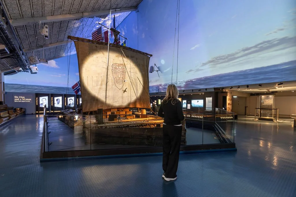 Den ikoniske Kon-Tiki-flåten møter deg i en ny og stemningsfull ramme. Over flåten spiller en levende himmel som skifter fra solfylte dager til dramatisk uvær og glitrende stjernehimmel – akkurat slik ekspedisjonen opplevde det.